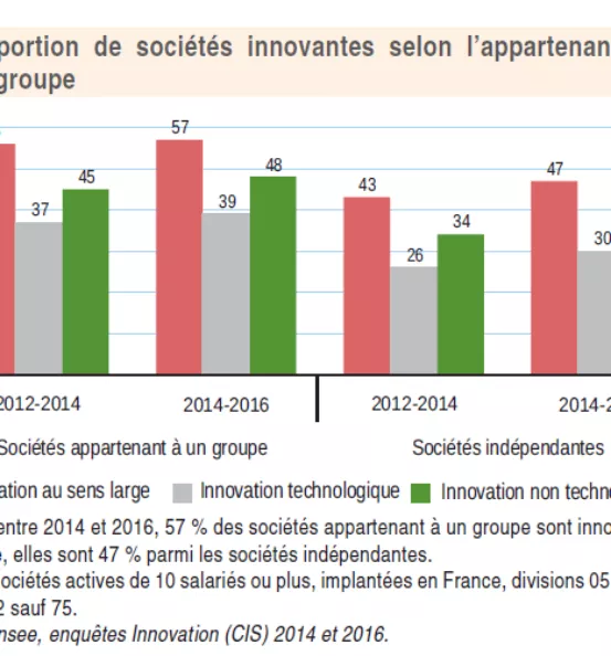 Ainsi parmi les sociétés indépendantes, la part des sociétés innovantes augmente plus vite (+ 4 points), réduisant ainsi l’écart à 10 points avec les sociétés appartenant à un groupe (versus 13 points sur la période 2012-2014).